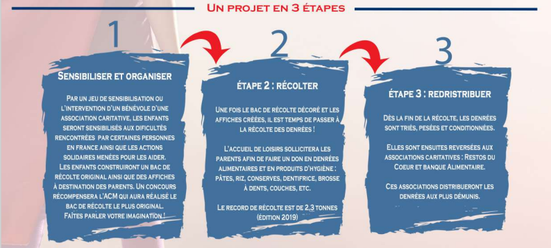 - 2019 : 2,3 tonnes de denrées et de produits d’hygiène - 70 ACM - 5000 enfants de 3 à 17 ans - près de 1000 animateurs mobilisés - Prix du bac de récolte pour les moins de 6 ans : ACM Aimé Legall de Mouans-Sartoux et pour les plus de 6 ans, l’accueil de loisirs de la Fermette de Plascassier ;